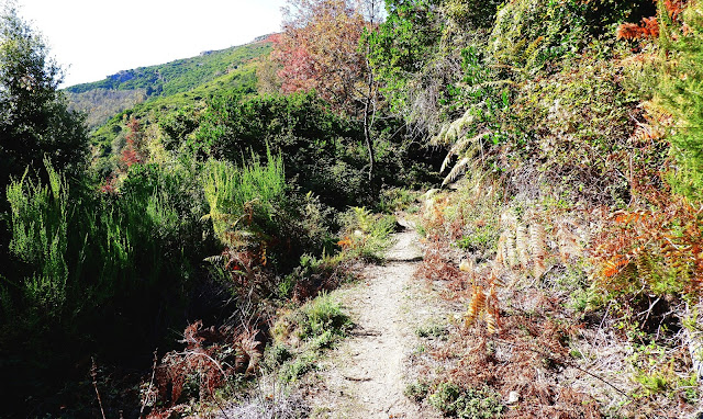 Au niveau du ruisseau, nous manquons la bifurcation à droite. Heureusement avec la trace téléchargée, on arrive à couper à travers les fougères pour reprendre le sentier.